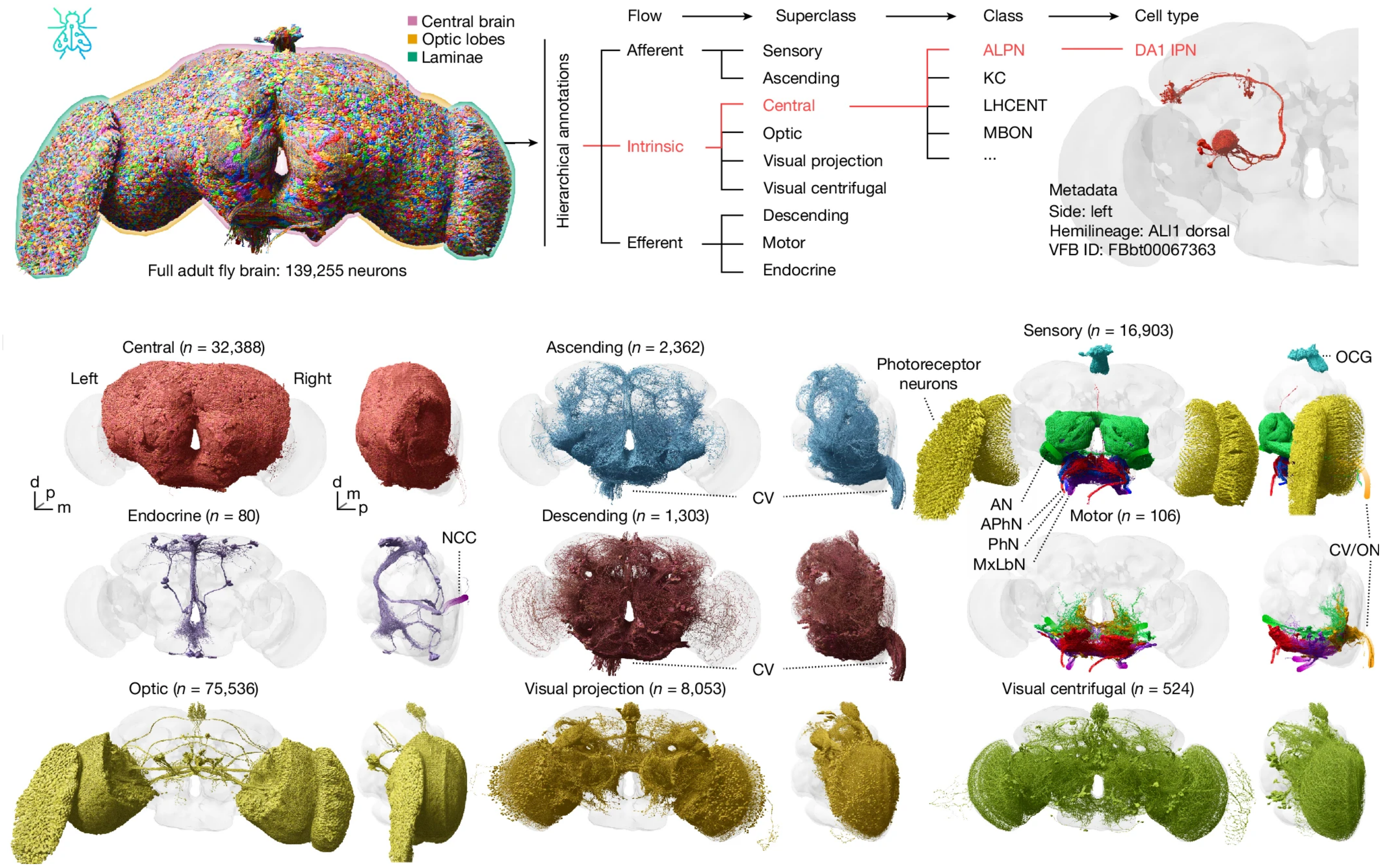 P Schlegel, Y Yin, AS Bates, S Dorkenwald, K Eichler, P Brooks, DS Han, M Gkantia, M dos Santos, EJ Munnelly, G Badalamente, L Serratosa Capdevila, VA Sane, MW Pleijzier, IFM Tamimi, CR Dunne, I Salgarella, A Javier, S Fang, E Perlman, T Kazimiers, SR Jagannathan, A Matsliah, AR Sterling, S Yu, CE McKellar, FlyWire Consortium, M Costa, HS Seung, M Murthy, V Hartenstein, DD Bock, GSXE Jefferis (2024) Whole-brain annotation and multi-connectome cell typing quantifies circuit stereotypy in Drosophila. Nature, 634, 139–152.